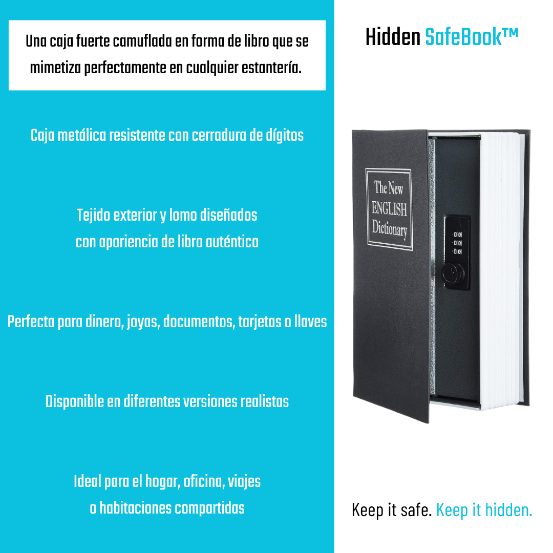 Caja de seguridad portátil que parece un libro, ideal para esconder objetos valiosos sin levantar sospechas. Disponemos de diseños realistas tipo “The New English Dictionary” o versiones decorativas (Ruta 66, Hollywood, París, Pisa)
